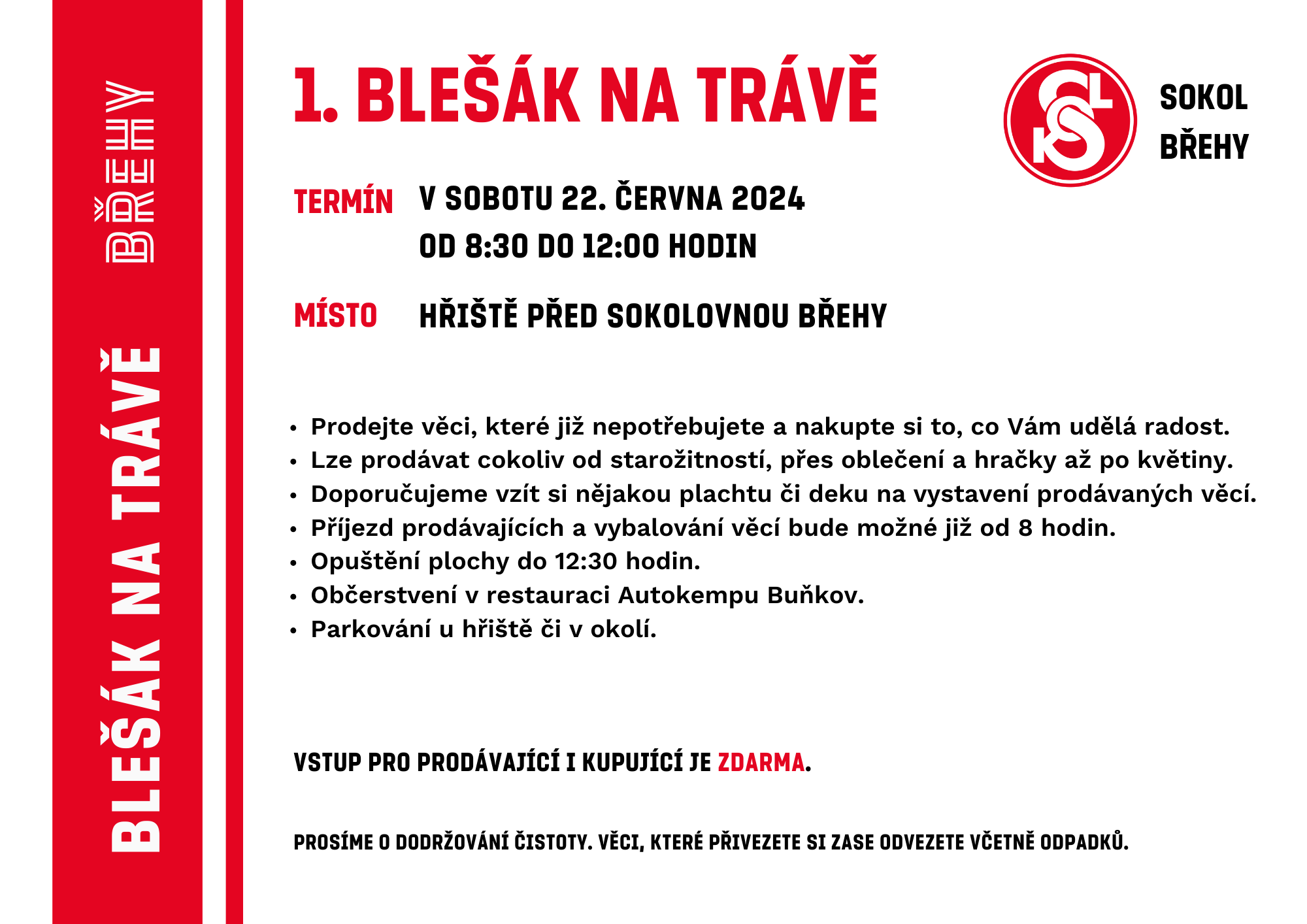 V sobotu 22. června 2024 od 8:30 do 12 hodin proběhne na hřišti před sokolovnou ve Břehách bleší trh. Přijďte sem prodat či věnovat věci, které již nepotřebujete a nakupte si to, co Vám udělá radost. Prodávajícím doporučujeme vzít si např. deku, na které mohou vystavit nabízené věci.Vstup je pro všechny zdarma.