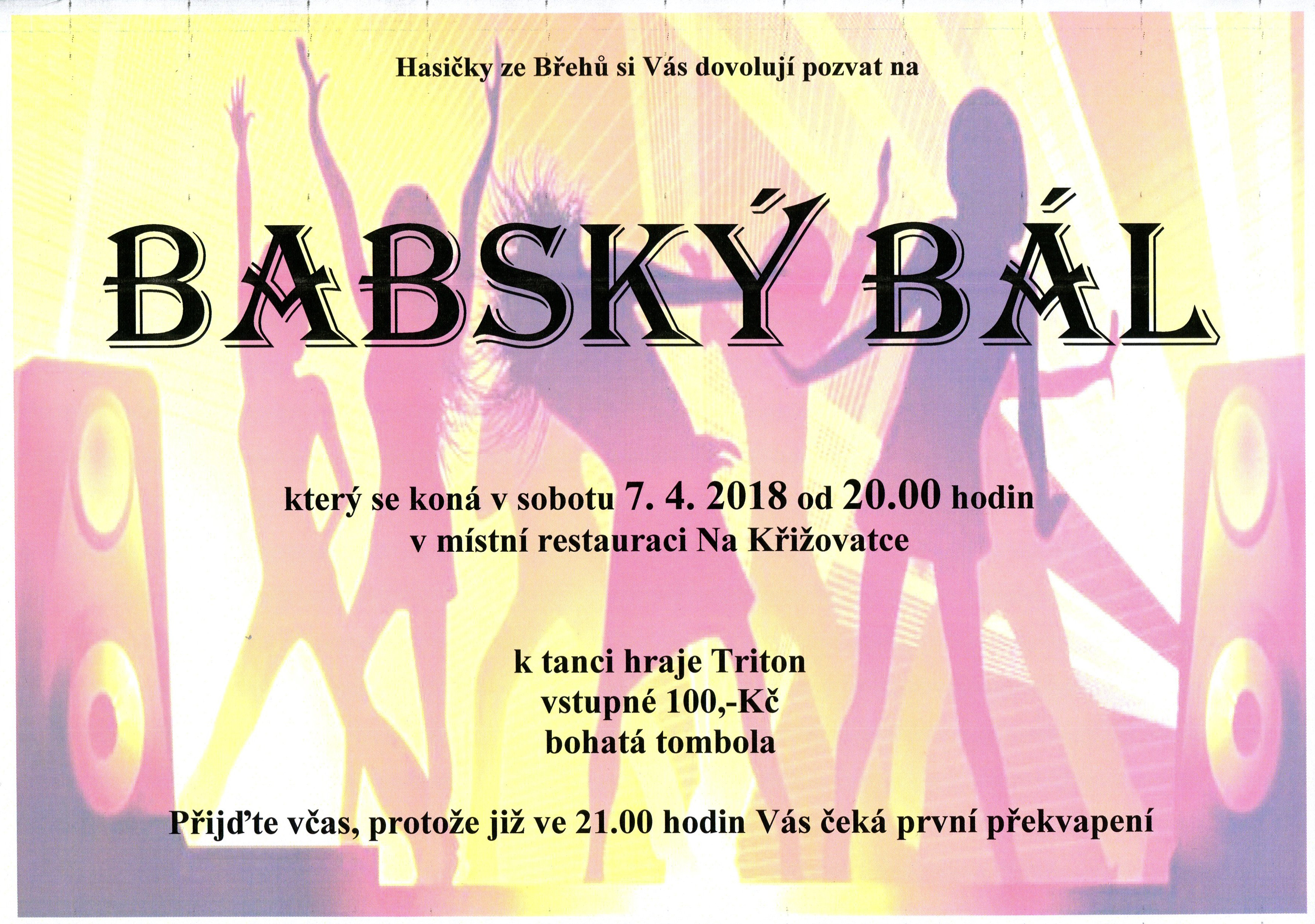 Babský bál Břehy 2018 Publikováno uživatelem Kaca dne 27 března 2018, 5:13 pm V sobotu 7. dubna 2018 od 20 hodin bude v restauraci Na Křižovatce tradiční Babský bál. K tanci a poslechu bude hrát kapela Triton, připravena bude bohatá tombola a první překvapení je plánováno už v 21 hodin. Vstupné 100 Kč.