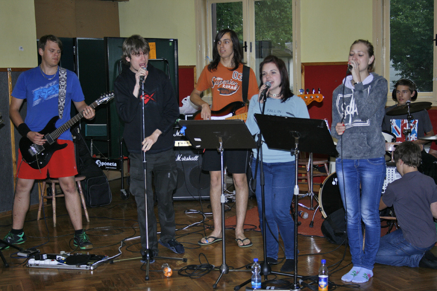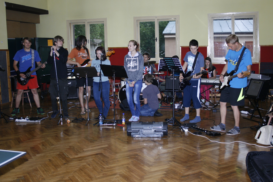 Kapela Buď fit v autokempu Buňkov - zkouška v sokolovně