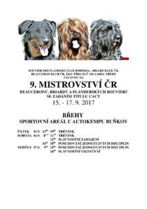 O víkendu 15.-17. září 2017 proběhne na hřišti ve Břehách 9. mistrovství České republiky psích plemen Beauceron, Briard a Flanderský bouvier se zadáním titulu CACT.