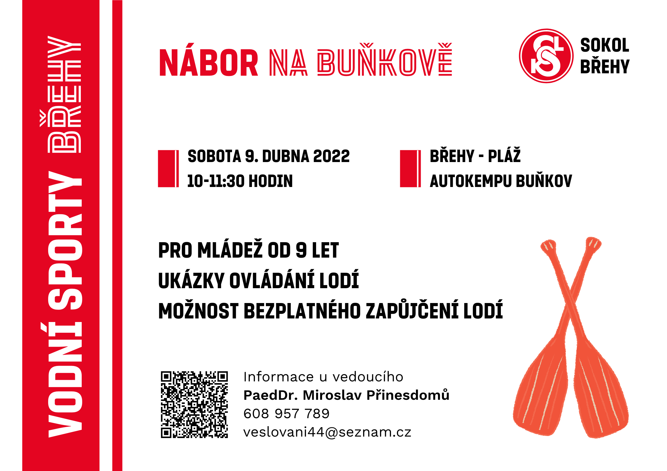 Nábor do oddílu vodních sportů Publikováno uživatelem Kaca dne 6 dubna 2022, 2:26 pm V sobotu 9. dubna 2022 od 10 do 11.30 h. se bude na pláži v autokempu Buňkov konat nábor mládeže do oddílu vodních sportů.
