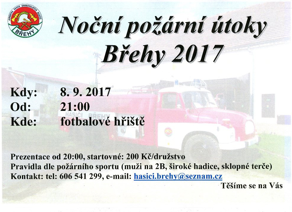 Noční požární útoky Břehy 2017 Publikováno uživatelem Kaca dne 15 srpna 2017, 8:02 pm V pátek 8. září 2017 od 21 hodin proběhnou na hřišti ve Břehách již tradiční noční požární útoky.