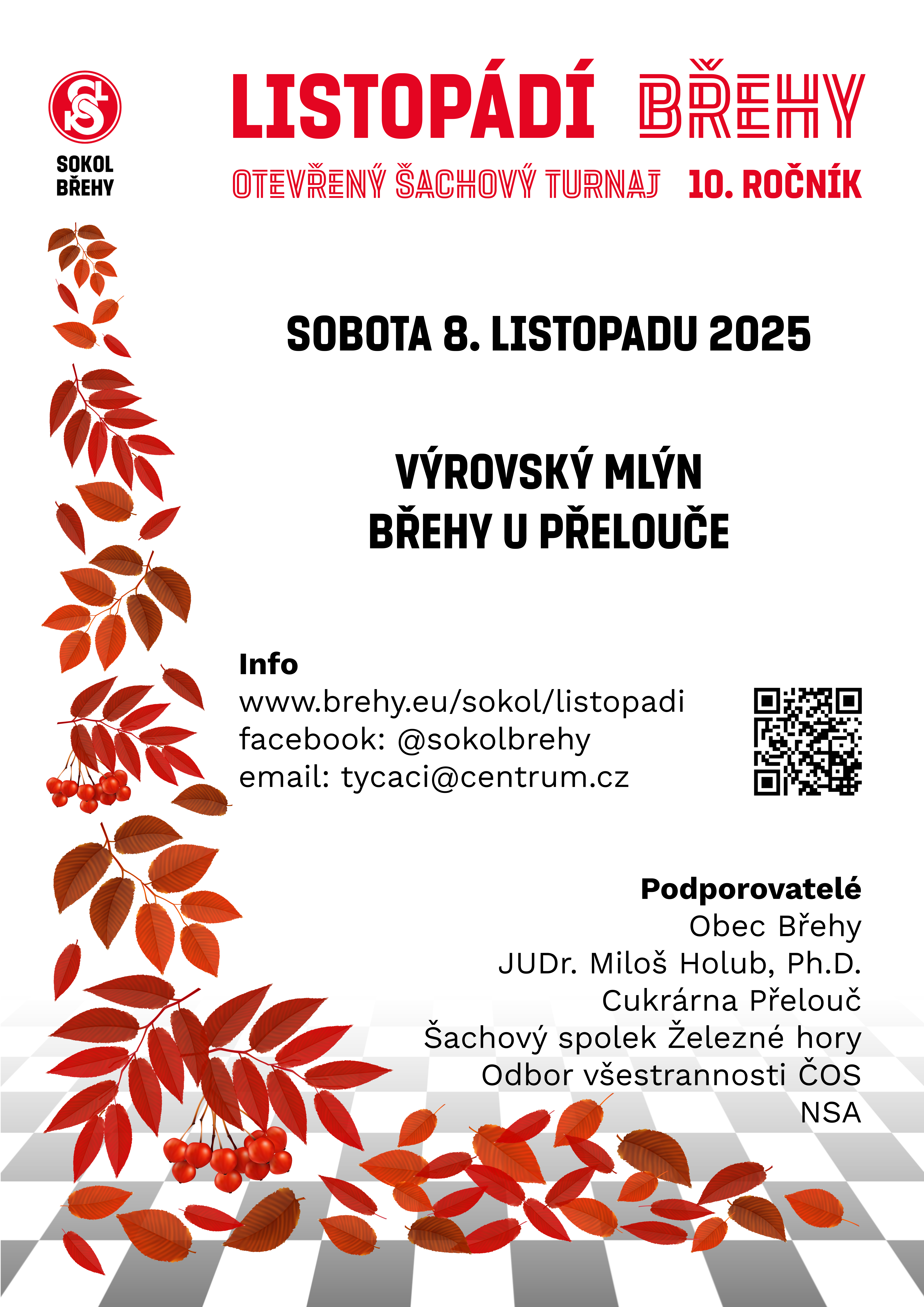 V sobotu 8. listopadu 2025 bude ve výrovském mlýně ve Břehách probíhat jubilejní 10. ročník otevřeného šachového turnaje. Veškeré informace najdete na Brehy.eu/sokol/listopadi.