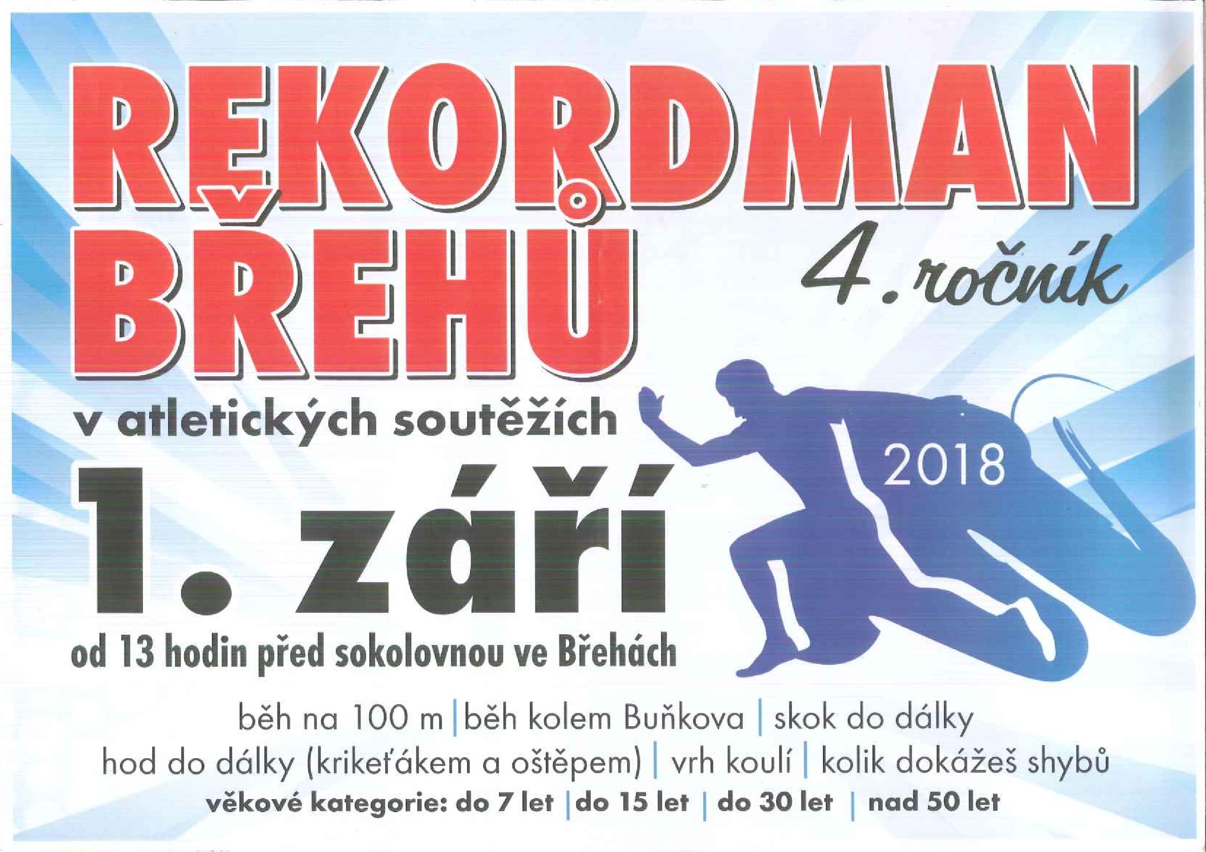 V neděli 16. 9. 2018 od 13 hodin bude před sokolovnou probíhat atletická soutěž „Rekordman Břehů“. Soutěžit se bude v následujících kategoriích: