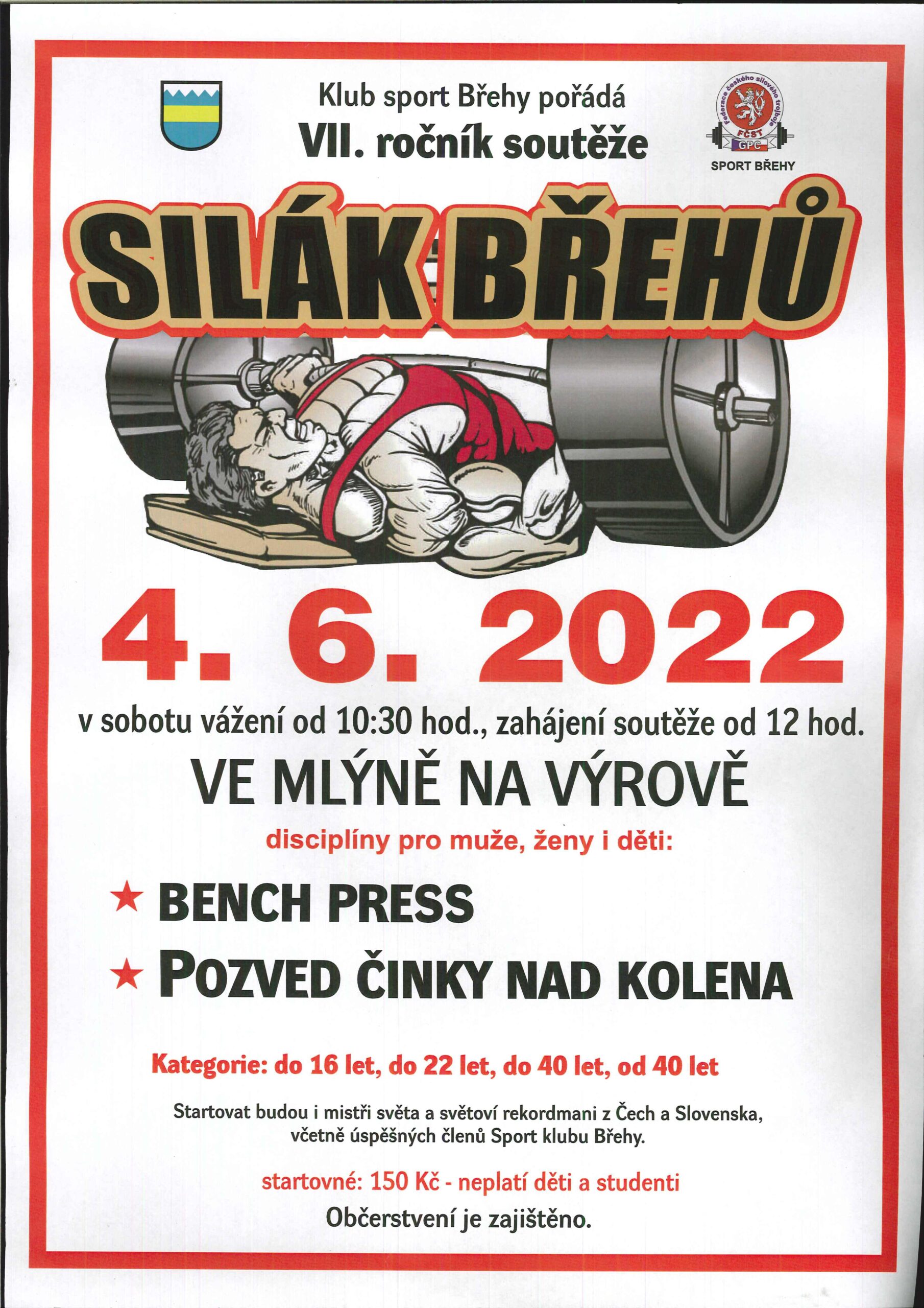 V sobotu 4. června 2022 od 12 hodin proběhne ve Výrovském mlýně ve Břehách odložený sedmý ročník soutěže Silák Břehů. Vážení začne v 10:30 h., startovné pro dospělé 150 Kč, občerstvení zajištěno.
