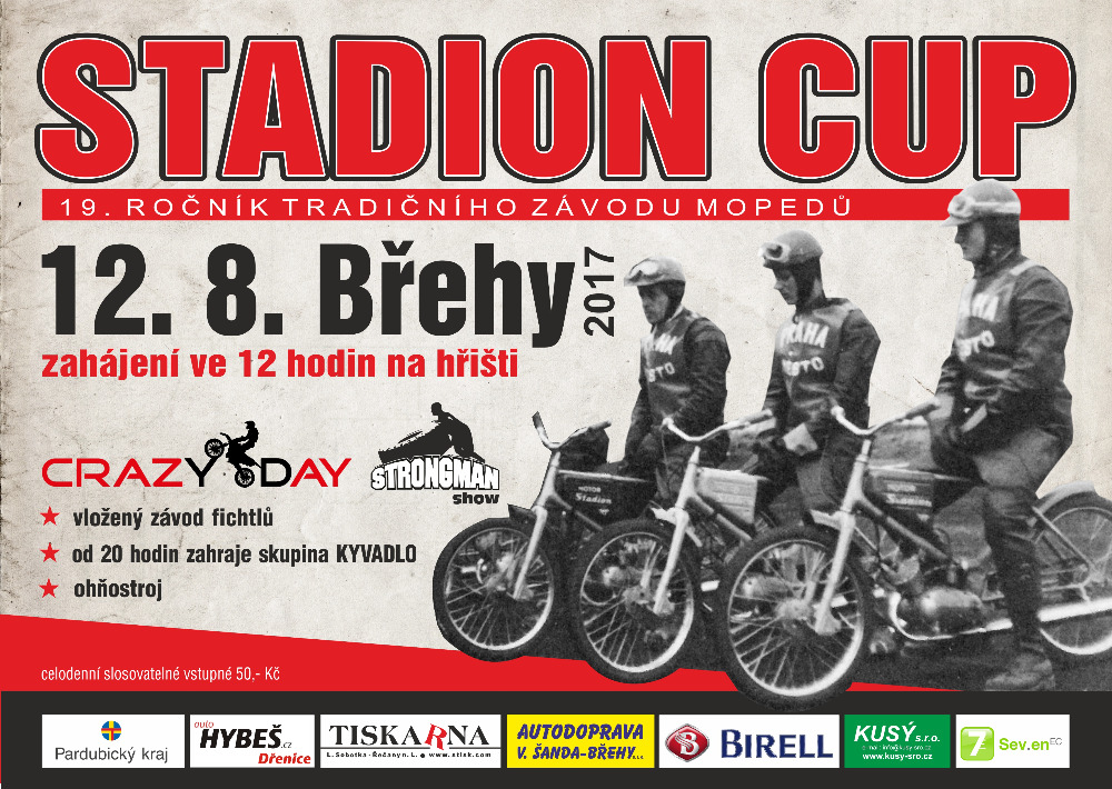 V sobotu 12. srpna 2017 ve 12 hodin odstartuje na hřišti ve Břehách závod mopedů a „padesátek“ české, nebo československé produkce Stadion cup Břehy 2017. Program se tradičně neomezí jen na sobotu, ale začne již v pátek večer s kapelami SMART BAND a JAHODY. Během soboty vystoupí kaskadérská skupina CRAZY DAY, siláci předvedou STRONGMAN show a uvidíte i historická vozidla. Večer nemůže chybět hudební skupina KYVADLO.