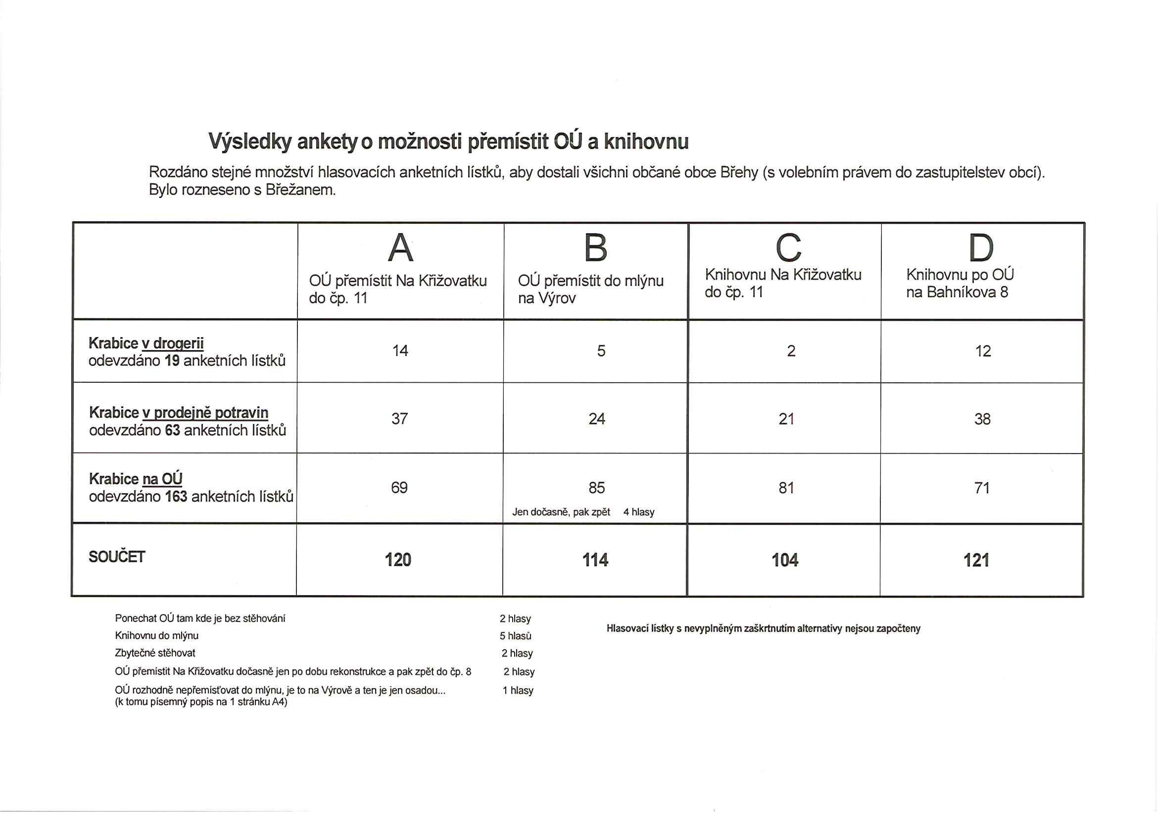 Ač na první pohled vypadají hlasovací listy barevně a hustě popsaně, tak se z nich nedozvíme dohromady vůbec nic. Jak je daleko z bývalé osady Výrova, jež původně nebyl ani součástí Břehů, do historického centra obce Břehy víme všichni, že je na Křižovatce hospoda víme taky a že se na mlýně ušetří za elektřinu? Pokud mlýn nebude mít jiné využití jako dosud, tak samozřejmě. Umístění ostatních institucí do mlýna na přemístění OÚ vůbec nezávisí. Vzhledem k tomu, jak obec rozhazuje peníze jinde, tak roční spotřeba elektřiny na jeden obecní úřad je jako kapka v moři. Navíc v případě zrekonstruovaného a zatepleného OÚ by se náklady logicky musely také snížit. Úspory je nutné hledat jinde, než na spotřebě elektřiny Obecním úřadem. Tedy dohromady žádná relevantní informace.