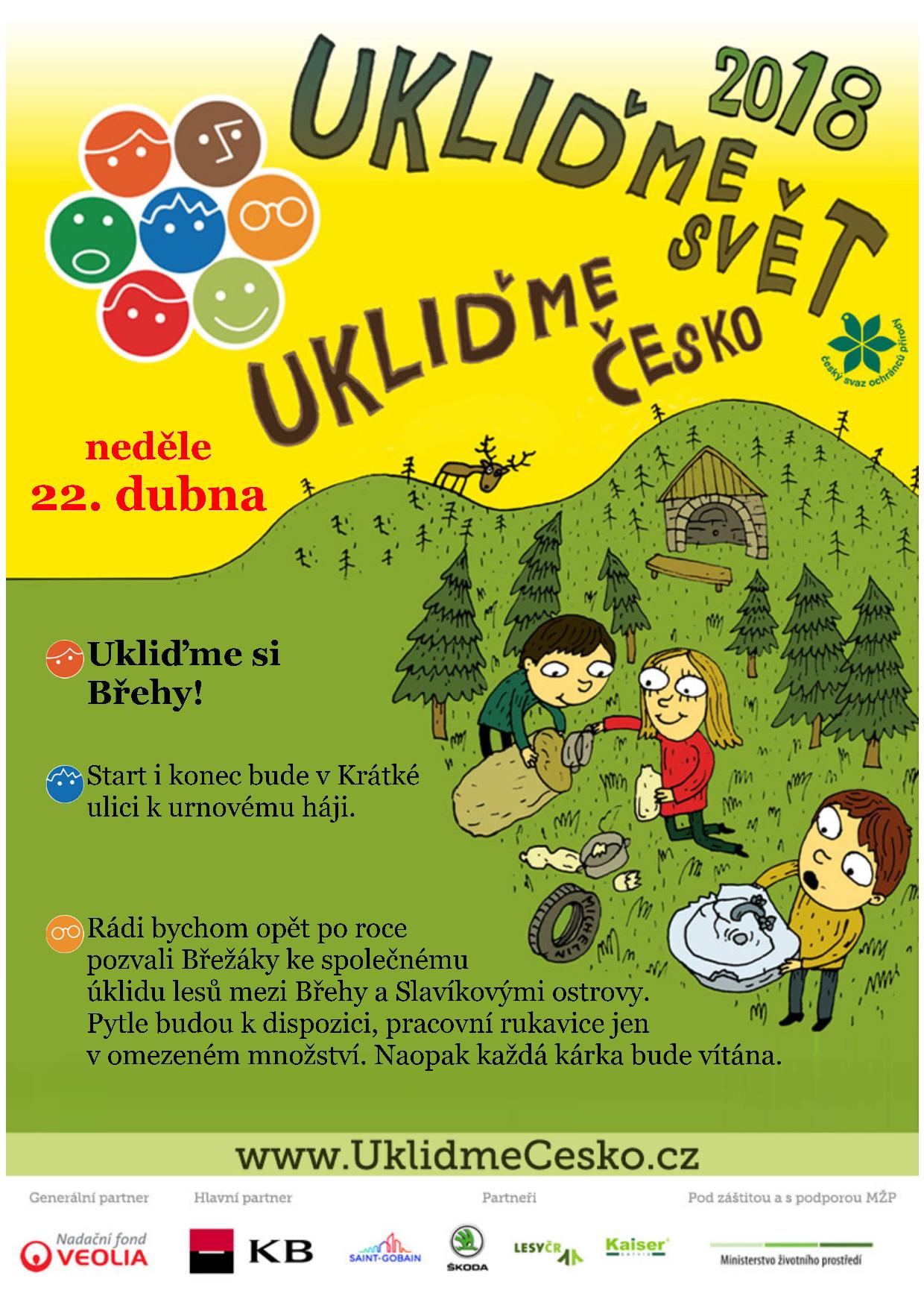 V neděli 22. dubna 2018 se ve Břehách opět připojíme k akci „Ukliďme svět, ukliďme Česko!“ Sejdeme se v 9 hodin v Krátké ulici k urnovému háji. Pytle budou k dispozici, pracovní rukavice jen v omezeném množství, naopak každá kárka bude vítána. Konec plánujeme nejdéle v poledne.