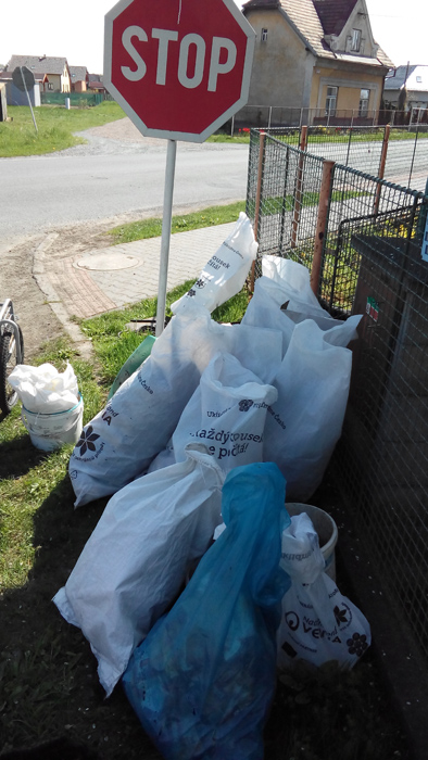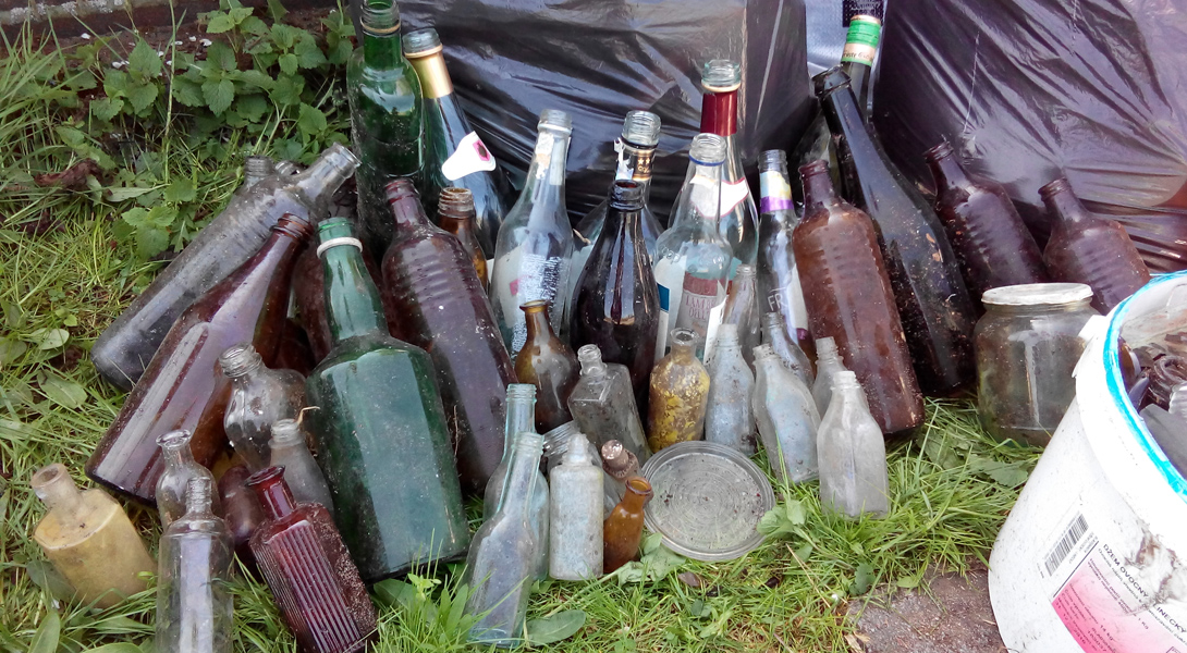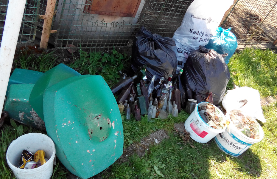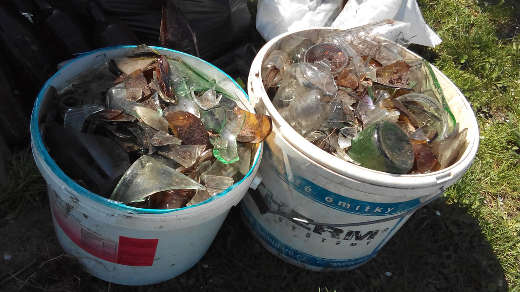 Letošní úklid byl ve znamení skla. Našli jsme celou sbírku lahví a lahviček od malých flakonek, přes lahve od oleje staré přes 30 let (ne, ani za 30 let nejeví sklo sebemenší známky rozkladu!), až po zjevně čerstvé lahve. Bohužel jsme také na dvou místech sesbírali a vykopali rozbitou sklokeramickou desku a rozbité skleněné tabule. Střepy vydaly na dva plné kýble.