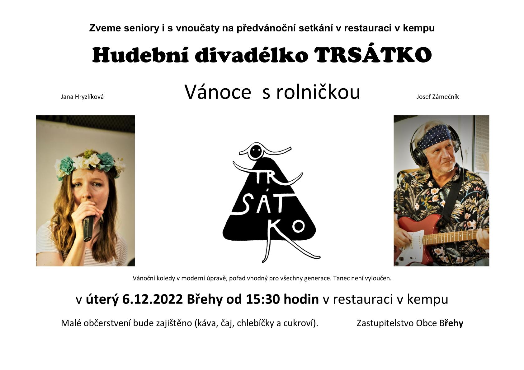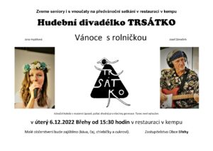 V úterý 6. prosince 2022 od 15.30 h. vystoupí v restauraci Autokempu Buňkov hudební divadlo Trsátko s představením Vánoce s rolničkou. Zajištěno bude i občerstvení.