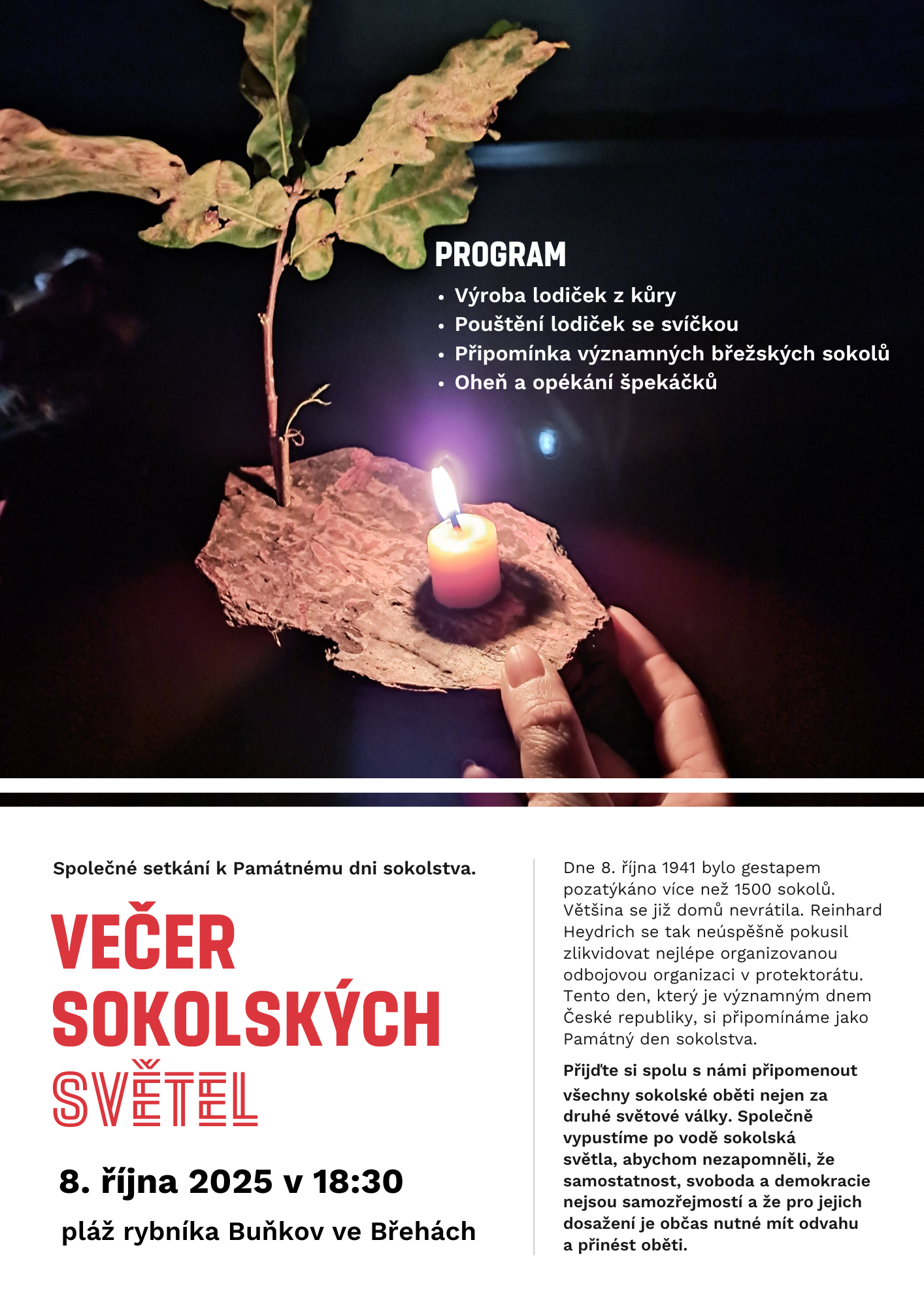 Ve středu 8. října 2025 se na pláži rybníka Buňkov ve Břehách uskuteční vzpomínková akce k Památnému dni sokolstva. Vše začne v 18:30 h. úvodním slovem a připomínkou významných břežských sokolů. Poté si každý bude moci vyrobit lodičku z kůry, kterou se zapálenou svíčkou společně vypustíme po hladině Buňkova. Bude připraven i oheň a špekáčky k opečení.