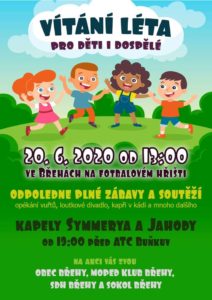 V sobotu 20. června 2020 bude od 13 hodin na hřišti ve Břehách probíhat odpoledne plné zábavy a soutěží. Nebude chybět např. loutkové divadlo, nebo oblíbený lov kaprů. Připraveny budou i buřty k opékání.