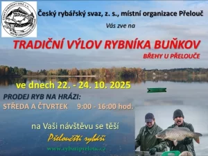 Výlov rybníka Buňkov 2025 Publikováno uživatelem Kaca dne 10 října 2025, 11:46 pm Od středy do pátku 22.-24. října 2025 bude ve Břehách probíhat tradiční výlov rybníka Buňkov. Prodej ryb na hrázi bude ve středu a ve čtvrtek vždy od 9 do 16 hodin.
