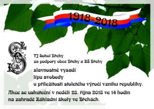 Vysazení lípy svobody ve Břehách Publikováno uživatelem Kaca dne 23 října 2018, 10:21 pm V neděli 28. října 2018 ve 14 hodin bude na zahradě ZŠ Břehy slavnostně vysazena lípa svobody u příležitosti stoletého výročí vzniku republiky.
