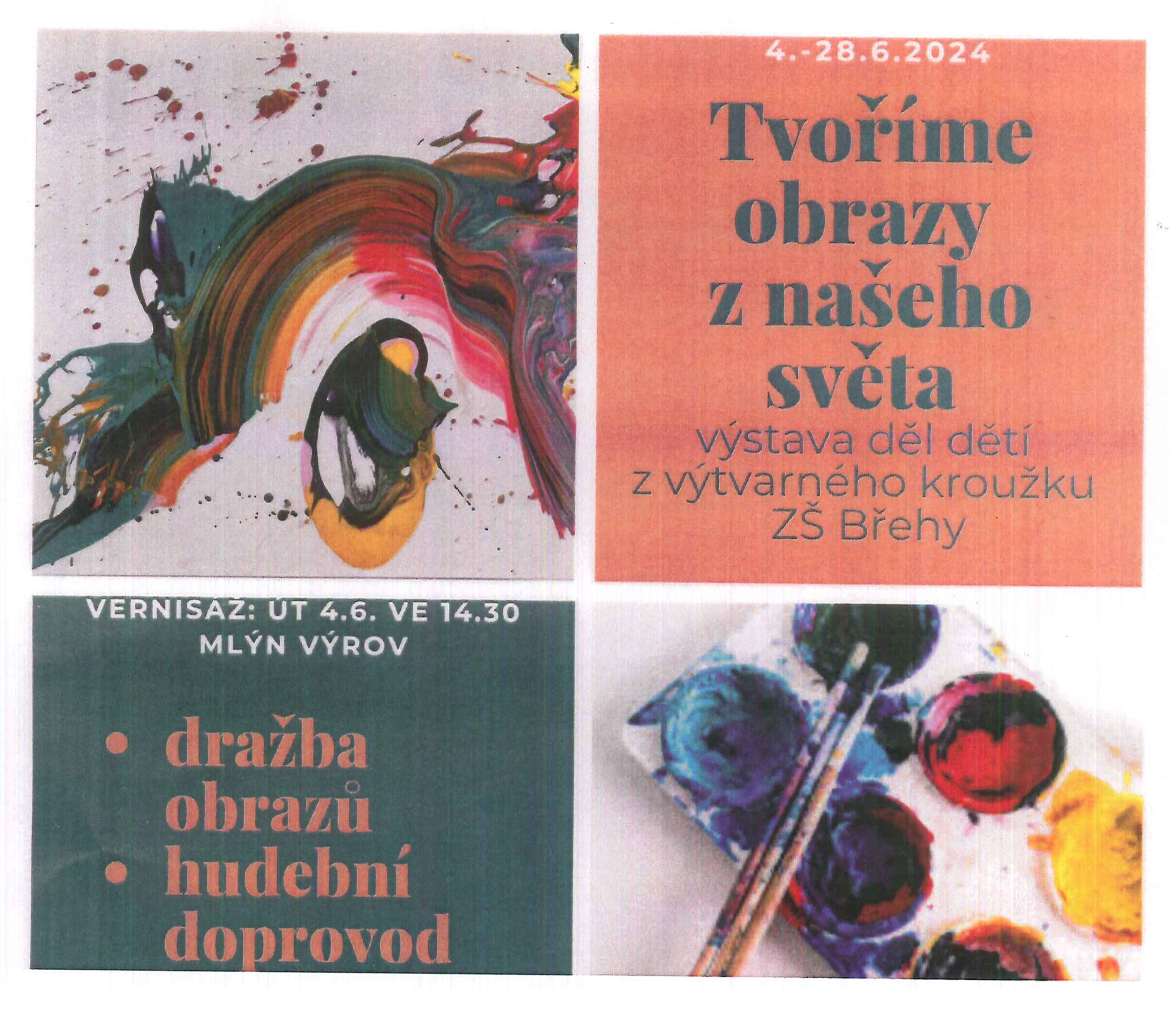 V úterý 4. června 2024 ve 14:30 hodin proběhne ve mlýně na Výrově vernisáž výstavy výtvarných prací dětí z výtvarného kroužku ZŠ Břehy. Vernisáž výstavy s názvem „Tvoříme obrazy z našeho světa“ bude mít hudební doprovod a bude zde probíhat dražba obrazů. Výstava potrvá do 28. 6. 2024.