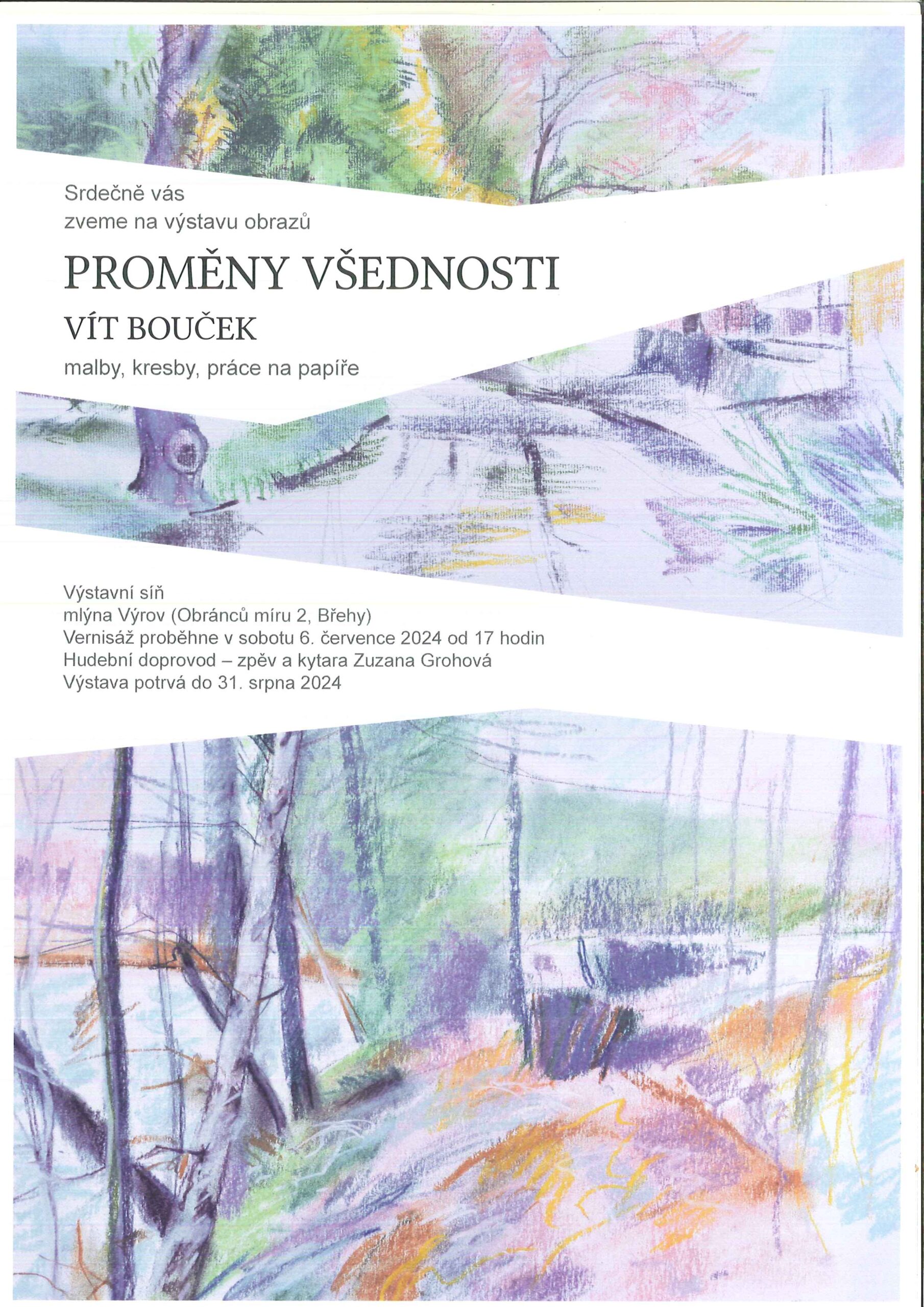 V sobotu 6. července 2024 v 17 hodin bude ve mlýně na Výrově ve Břehách zahájena výstava obrazů Víta Boučka s názvem Proměny všednosti. Vernisáž hudebně doprovodí Zuzana Grohová.