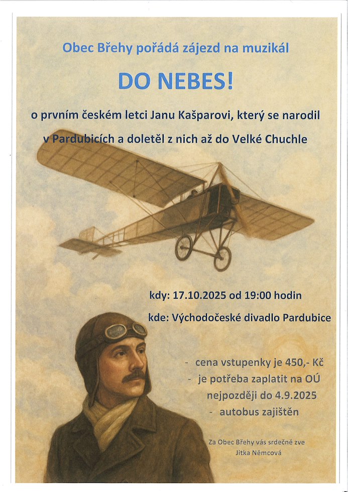 V pátek 17. října 2025 vypraví Obec Břehy autobusový zájezd do Východočeského divadla v Pardubicích na muzikál Do nebes! Cenu vstupenky 450 Kč je nutné uhradit na OÚ nejpozději do 4. září.